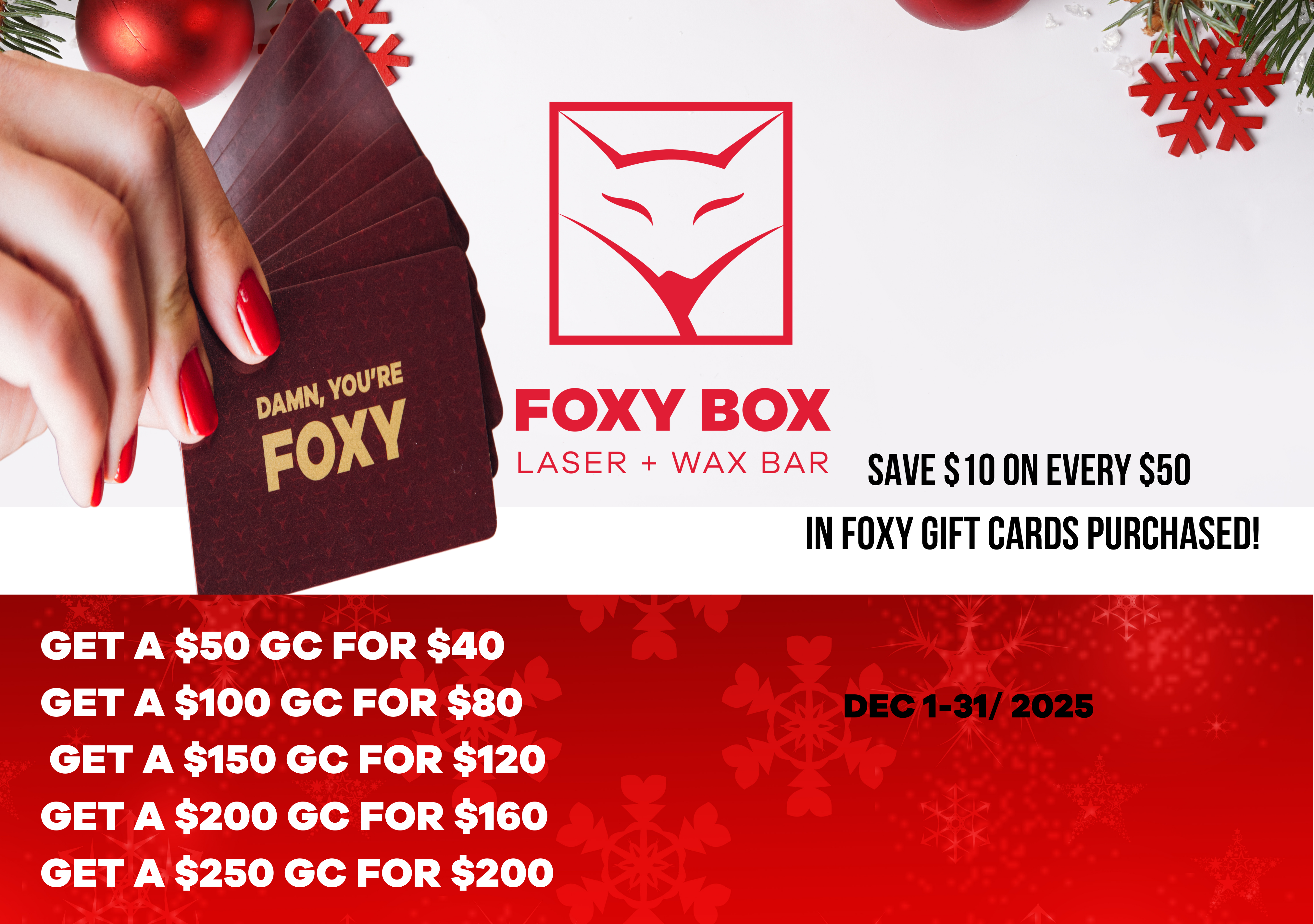 Save $10 on every $50 purchase in Foxy Box gift cards purchased from December 1st-30th! Available in store or online. *Gift cards can not be used on the same visit as they were purchased*